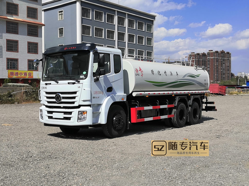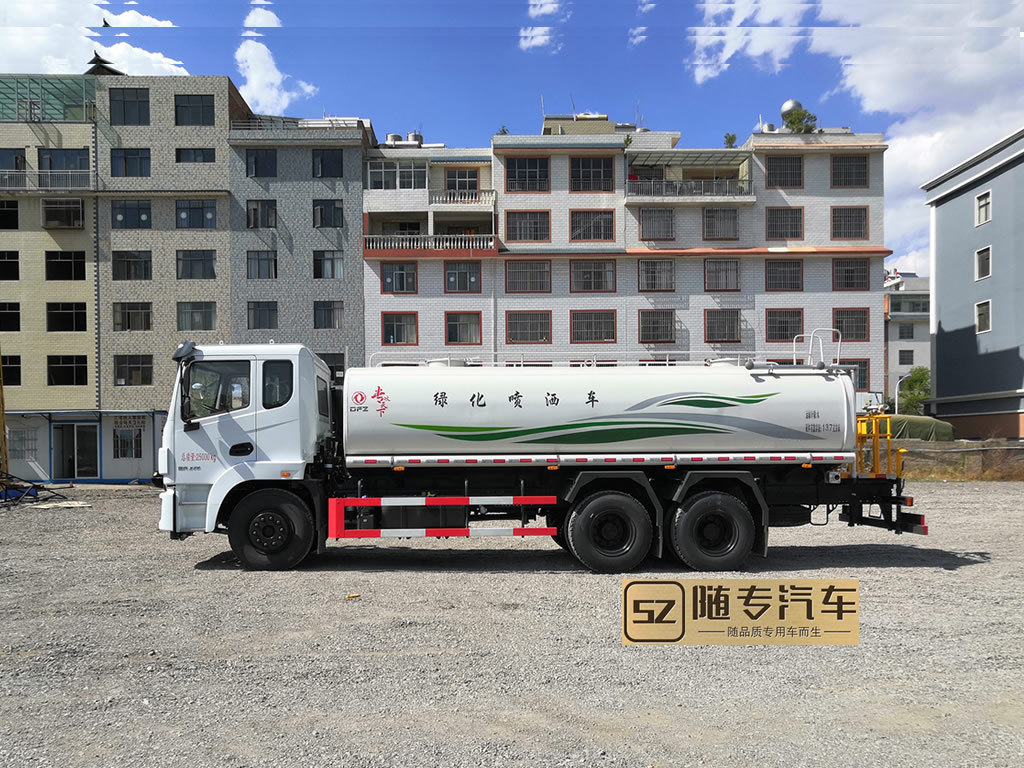 罐体有效容积:14.38立方米,运输介质:水,密度为:1000千克/立方米;罐体外形尺寸(长×宽×高)(mm): 6700×2350×1530.侧,后防护材质:Q235-A,连接方式:螺栓连接;后防护断面尺寸/离地高:120×60/490(mm).外形尺寸/前悬/后悬对应关系:10440/4350+1350/1515/3225,10440/4750+1350/1475/2865(1515/2825),10400/4350+1350/1475/3225,10090/4350+1350/1515/2875,10050/4350+1350/1475/2875,10720/4750+1350/1475/3145(1515/3105).仅选4350+1350,4750+1350(mm)轴距.随底盘选装驾驶室前脸局部造型变化,选装遮阳罩,选装排气管样式.选装后上部喷雾装置,选装后操作平台样式,选装后作业指示灯,选装卷盘,选装前置鸭嘴,选装喷雾机,选装罐体两侧方形管筒,选装不带上绿化浇灌;安装具有卫星定位功能的行驶记录仪.ABS生产厂家;东科克诺尔商用车制动系统(十堰)有限公司, 浙江万安科技股份有限公司,型号:3631010-C2000, VIE ABS-Ⅱ.