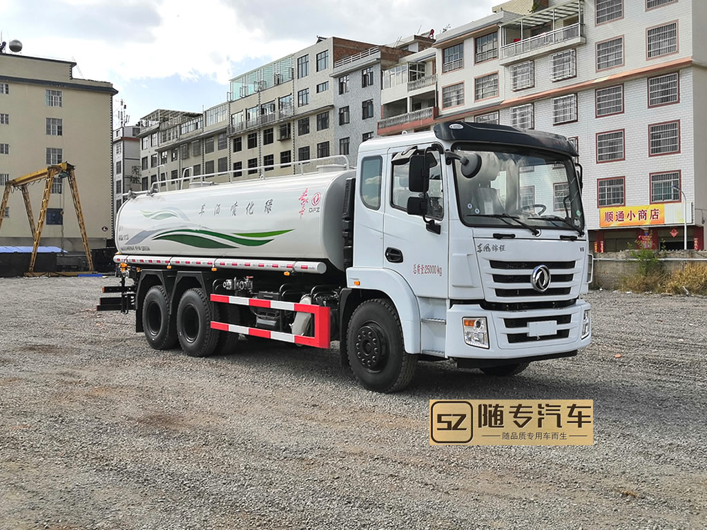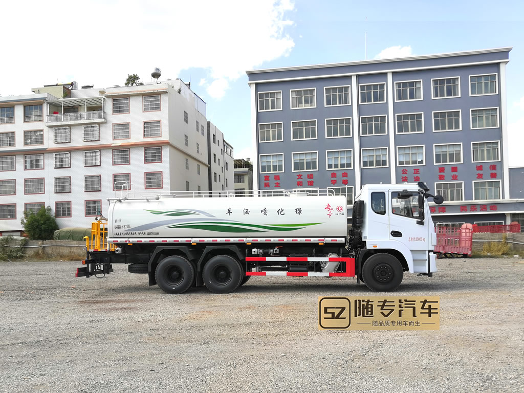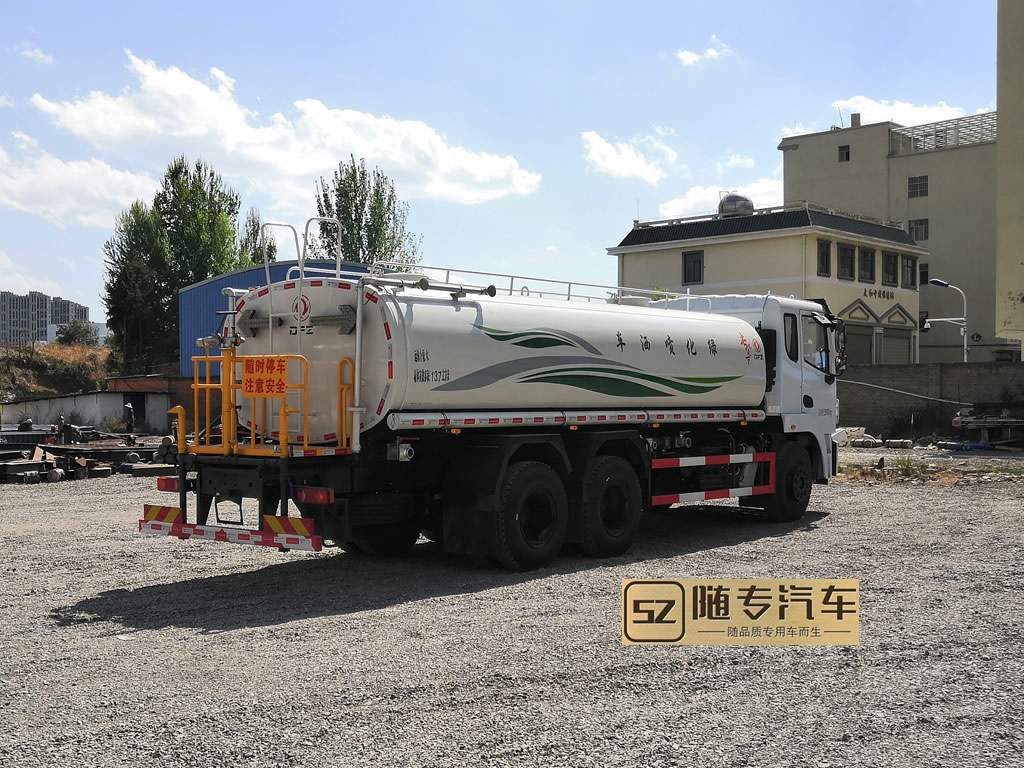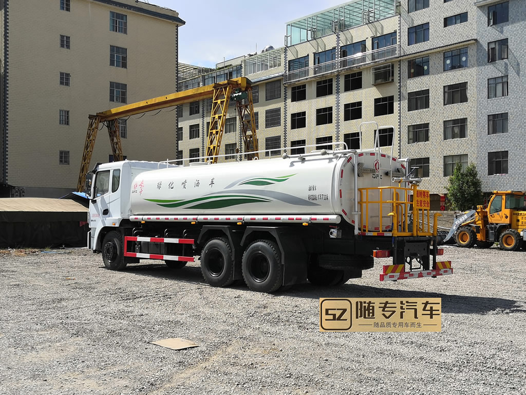 罐体有效容积:14.38立方米,运输介质:水,密度为:1000千克/立方米;罐体外形尺寸(长×宽×高)(mm): 6700×2350×1530.侧,后防护材质:Q235-A,连接方式:螺栓连接;后防护断面尺寸/离地高:120×60/490(mm).外形尺寸/前悬/后悬对应关系:10440/4350+1350/1515/3225,10440/4750+1350/1475/2865(1515/2825),10400/4350+1350/1475/3225,10090/4350+1350/1515/2875,10050/4350+1350/1475/2875,10720/4750+1350/1475/3145(1515/3105).仅选4350+1350,4750+1350(mm)轴距.随底盘选装驾驶室前脸局部造型变化,选装遮阳罩,选装排气管样式.选装后上部喷雾装置,选装后操作平台样式,选装后作业指示灯,选装卷盘,选装前置鸭嘴,选装喷雾机,选装罐体两侧方形管筒,选装不带上绿化浇灌;安装具有卫星定位功能的行驶记录仪.ABS生产厂家;东科克诺尔商用车制动系统(十堰)有限公司, 浙江万安科技股份有限公司,型号:3631010-C2000, VIE ABS-Ⅱ.